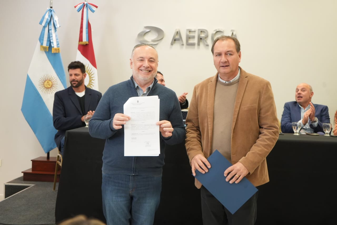 El intendente Eduardo Accastello junto al ministro de Producción, Ciencia e Innovación Tecnológica, Pedro Dellarossa, entregaron un aporte no reembolsable a Aerca para conformar el segundo Centro Comercial a Cielo Abierto de Villa María.