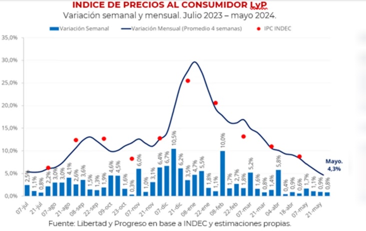 El IPC de la Fundación Libertad y Progreso arrojó un aumento de 4,3% en mayo, desacelerándose 4,5 puntos porcentuales respecto a la medición oficial de abril (8,8%). De esta manera, en los primeros cinco meses del año el IPC acumula una suba de 72,1%. La variación interanual alcanza el 276,9%, mostrando la primera desaceleración en 10 meses.