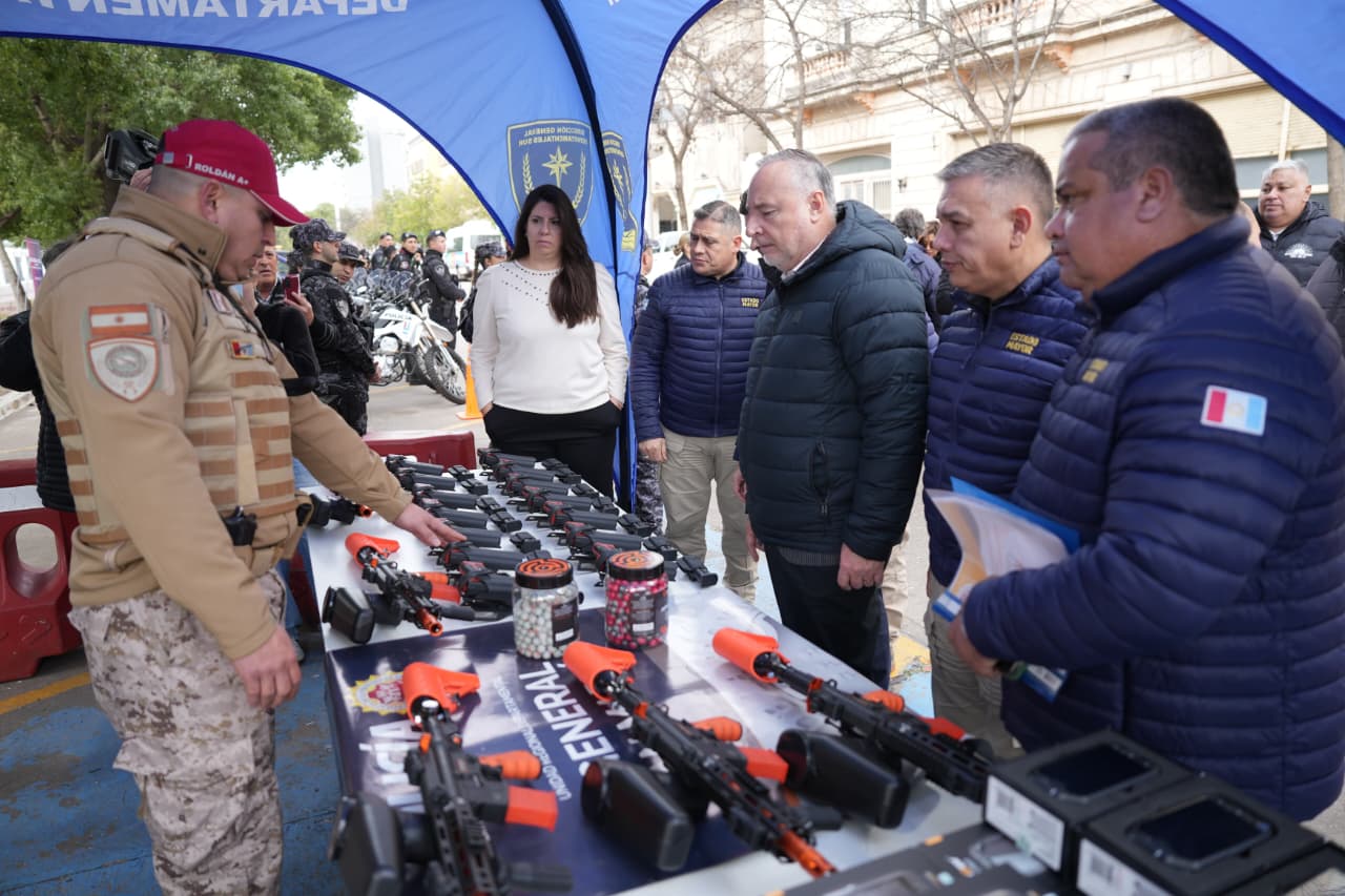 Tras la reunión se presentaron 10 motos cero kilómetros provistas por la Policía de Córdoba, junto a 54 teléfonos Ruger de última tecnología con sistemas policiales y otros cinco dispositivos del programa “Tribuna Segura”, cinco chalecos para la Guardia Local y 40 armas Byrna y 10 de tipo Mission Four y nuevo uniforme para la Patrulla Preventiva.