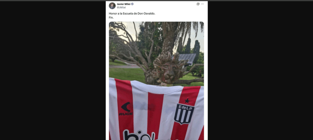 Desde la Quinta de Olivos, Milei tuiteó una foto de la camiseta de Estudiantes, acompañada de un mensaje conciso que hace referencia a una de las figuras más importantes de la historia del club. “Honor a la Escuela de Don Osvaldo. Fin”, escribió.