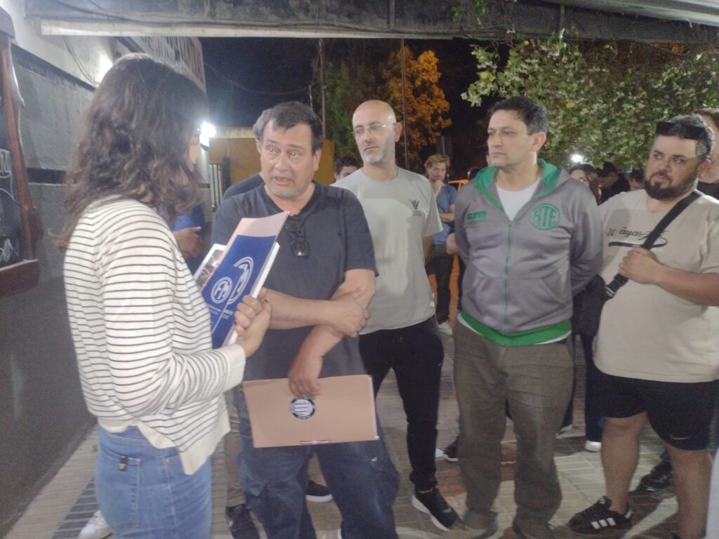 Antes del acto con la militancia, la principal candidata del espacio recibió un petitorio de un grupo de trabajadores de la Fábrica Militar en el cual se denuncia el vaciamiento de la empresa. También habló con la prensa en la puerta del club de calle Rucci.