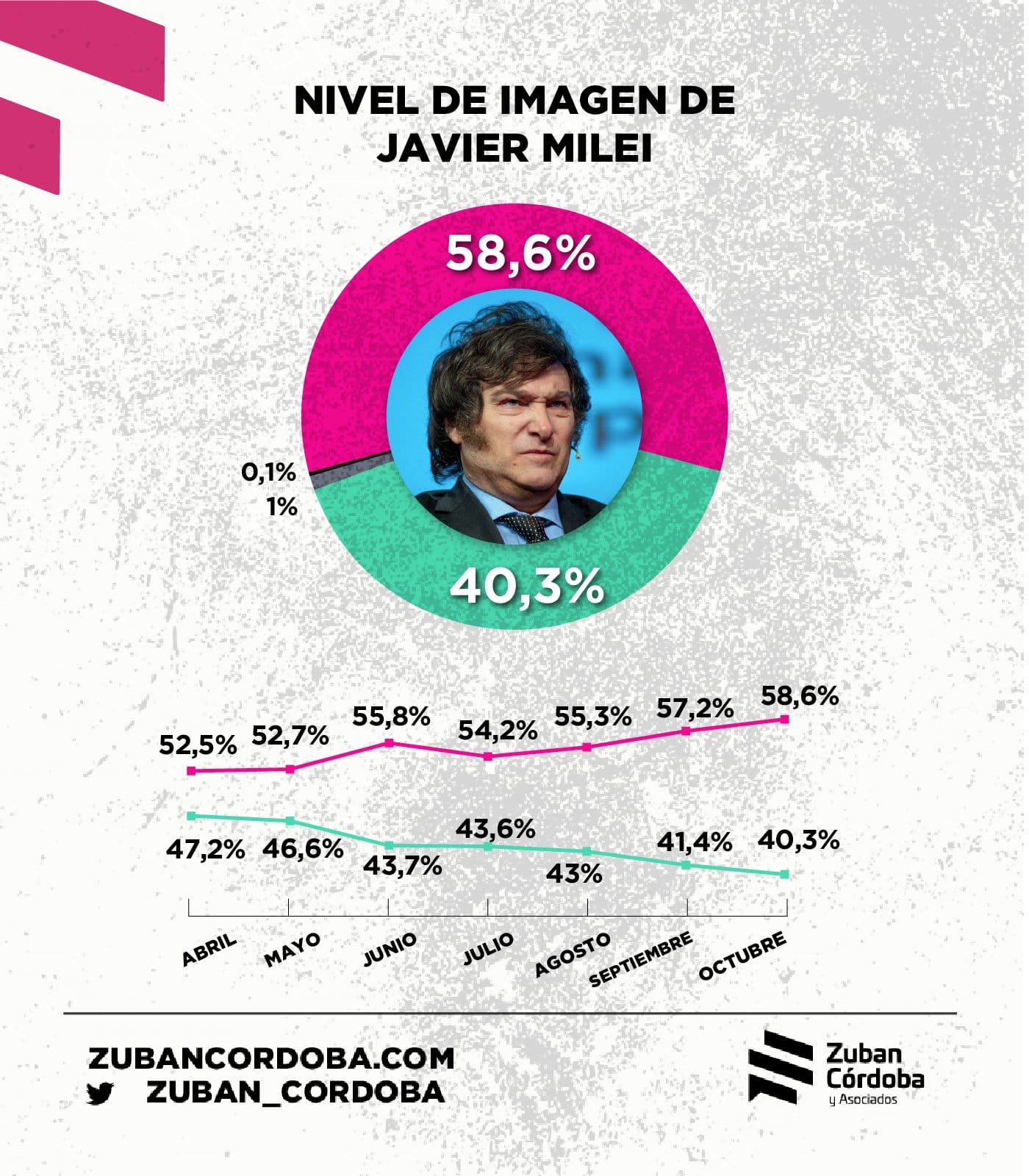 La imagen del Presidente Javier Milei se derrumba a raíz de un punto porcentual por mes. Termina octubre apenas arriba del 40% cuando en abril superaba el 47%.