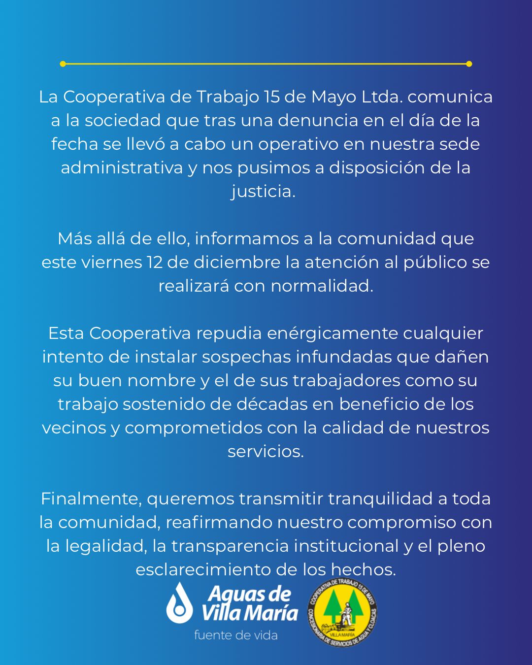 Esta cooperativa repudia enérgicamente cualquier intento de instalar sospechas infundadas que dañen su buen nombre y el de sus trabajadores como su trabajo sostenido de décadas en beneficio de los vecinos y comprometidos con la calidad de nuestros servicios